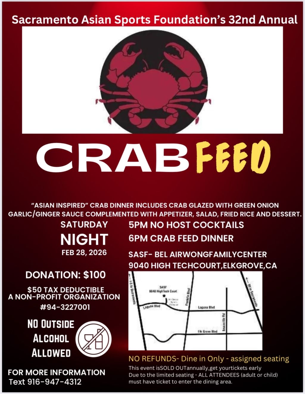 Join the Sacramento Asian Sports Foundation for our 32nd Annual Crab Feed on Saturday, February 28, 2026, for an unforgettable night of great food and community!