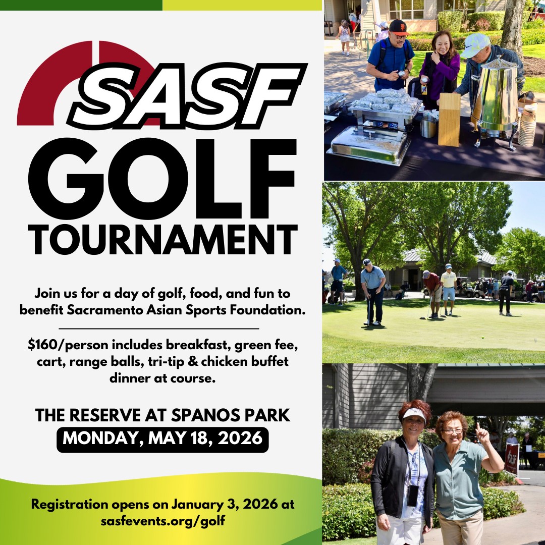 Registration opens on Saturday, January 3, 2026 at https://www.sasfevents.org/golf for the 2026 SASF Golf Tournament, happening at The Reserve at Spanos Park in Stockton, CA on Monday, May 18, 2026.